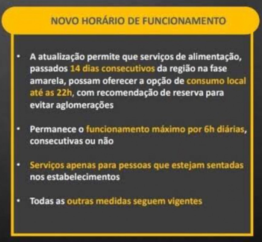 Passados 14 dias na fase amarela do Plano São Paulo de enfrentamento à COVID-19, o município autoriza o funcionamento com limitação de 40% do público até 22 horas.