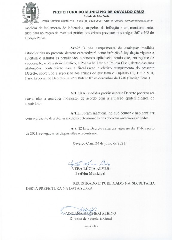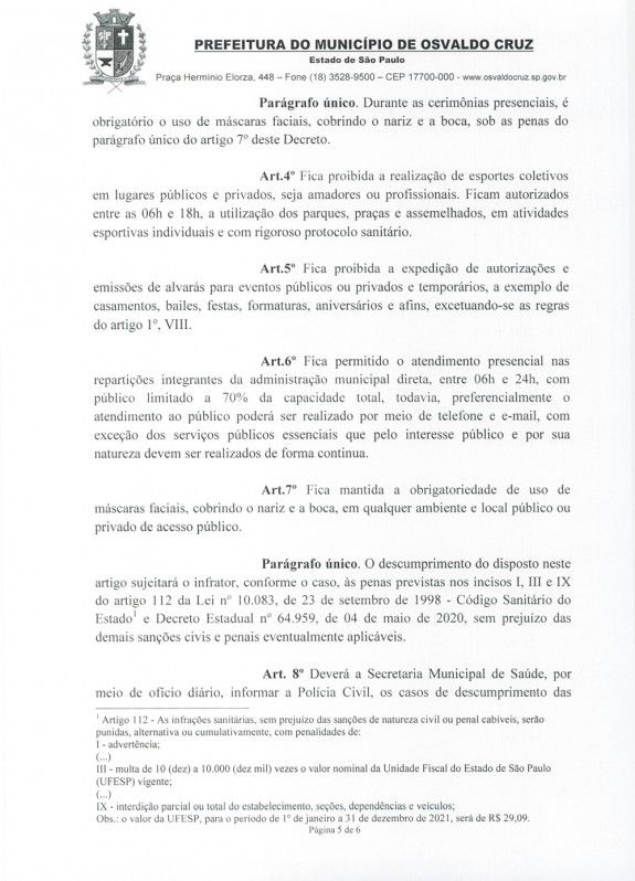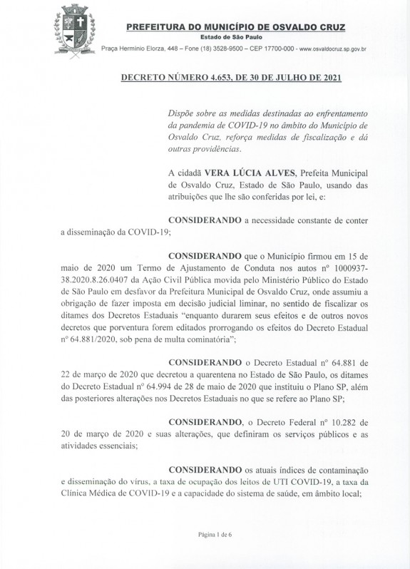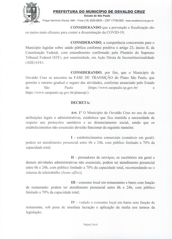 A Prefeitura de Osvaldo Cruz publicou na sexta-feira (30) o Decreto Municipal 4.653/2021 para transição da economia local frente à pandemia da Covid-19. A vigência da medida começou no domingo, 1.