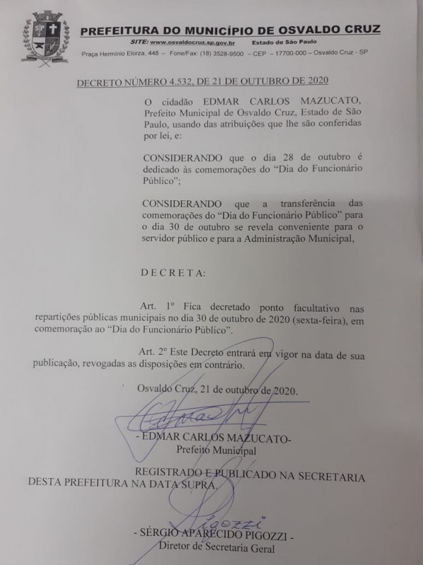A Prefeitura de Osvaldo Cruz, através do Decreto 4532/2020, determinou que a troca do ponto facultativo do Dia do Funcionário Público, quarta-feira, 28, para a sexta-feira, 30 de Outubro.