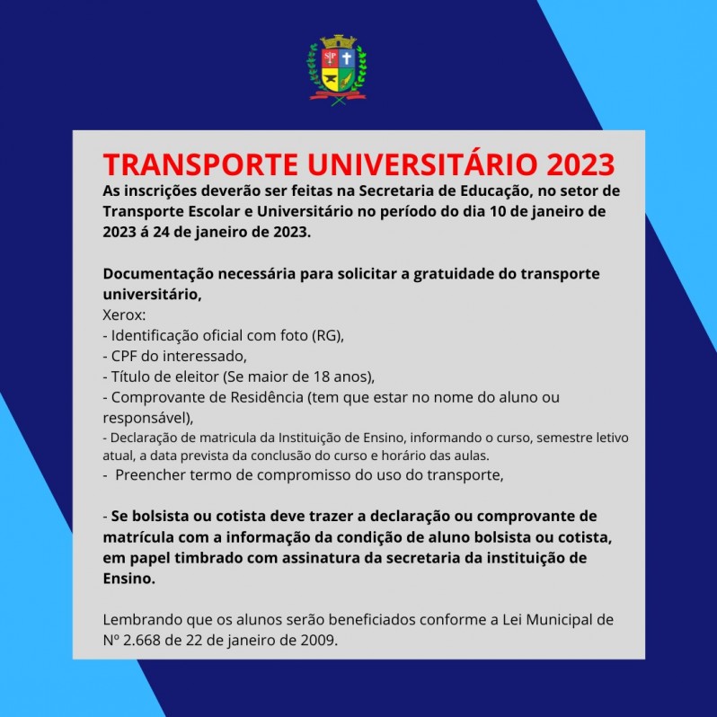 Lembrando que os alunos serão beneficiados conforme a Lei Municipal de Nº 2.668 de 22 de janeiro de 2009.
