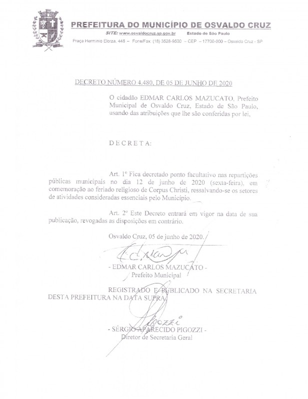 O prefeito de Osvaldo Cruz, Edmar Mazucato, decretou ponto facultativo nesta sexta-feira, dia 12 de junho. Como na quinta-feira é feriado DE Corpus Christi, na sexta as repartições públicas em geral vão fechar as portas também.