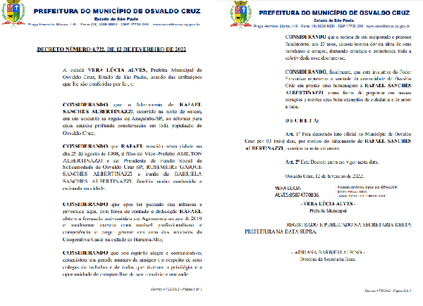 Art. 1o Fica decretado luto oficial no Município de Osvaldo Cruz por 03 (três) dias, por motivo do falecimento de RAFAEL SANCHES ALBERTINAZZI, ocorrido na noite de ontem.