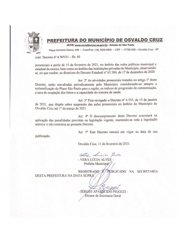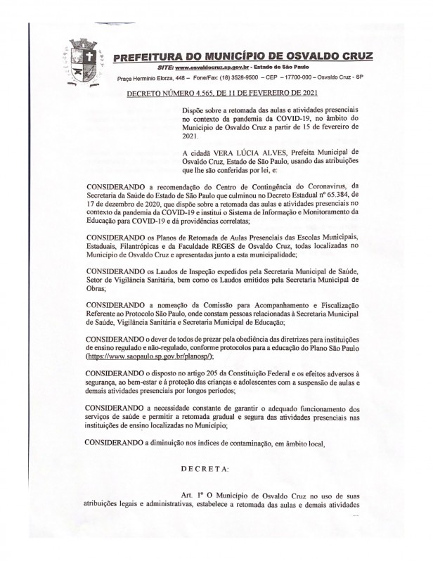 A Prefeitura de Osvaldo Cruz publicou na manhã desta sexta-feira (12) o decreto 4.565/21 que autoriza a retomada de aulas presenciais em escolas públicas e particulares do município.