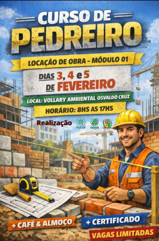 A Prefeitura de Osvaldo Cruz, em parceria com o Serviço Nacional de Aprendizagem Rural (SENAR/SP) e a Federação da Agricultura e Pecuária do Estado de São Paulo (FAESP), promove o Curso de Pedreiro – Módulo 01: Locação de Obra.