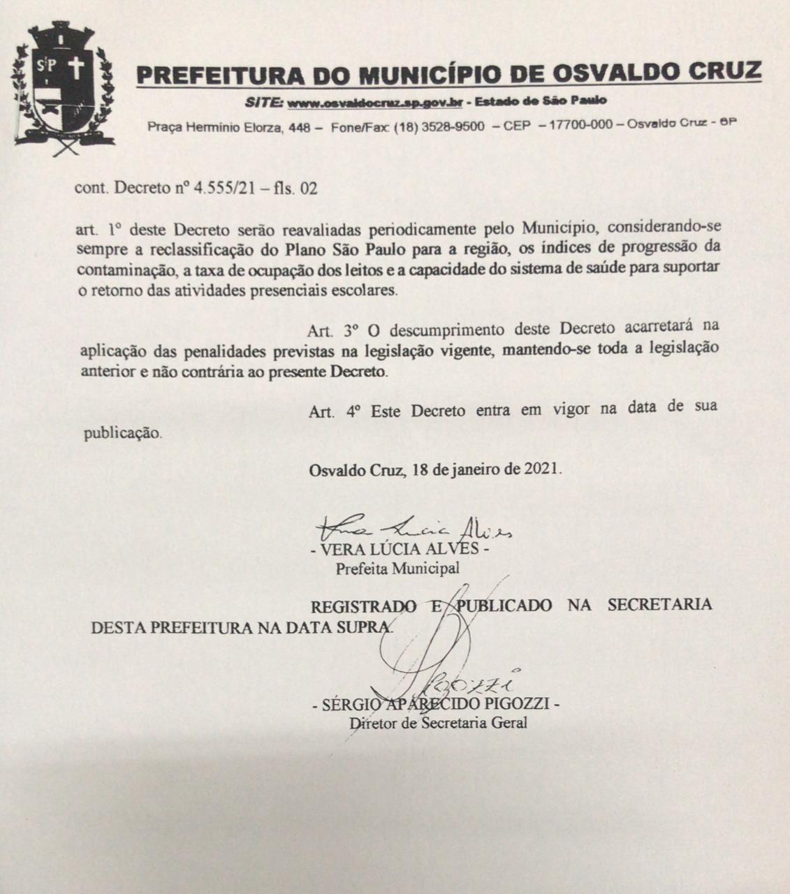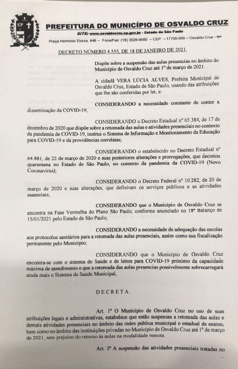 A Prefeita Vera Lúcia Alves, a Vera Morena, editou o decreto 4555/2021 em que suspende pelo menos até o dia 1º de março a retomada de aulas presenciais em escolas do Município de Osvaldo Cruz.