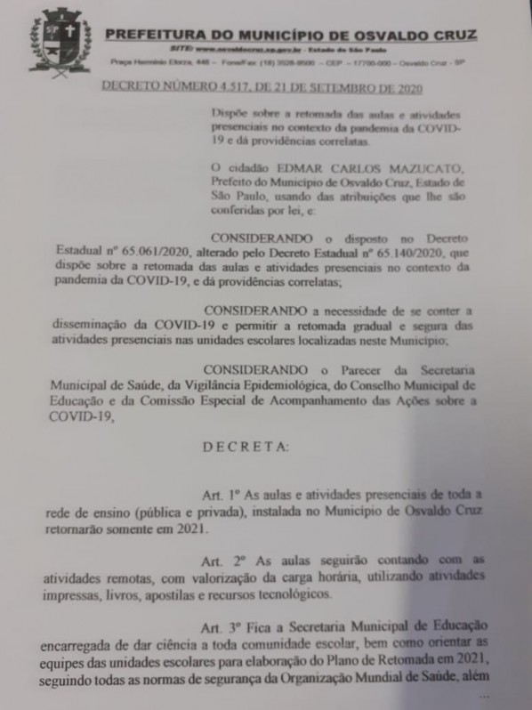 Depois de muitas analises, pesquisas e reuniões entre Prefeitura Municipal, Secretaria de Educação, Secretaria de Saúde e Vigilância Epidemiológica, ficou decidido que as aulas presenciais em Osvaldo Cruz devem ser retomadas somente em 2021. No momento, todas as aulas remotas com apoio das unidades escolares do município estão mantidas.