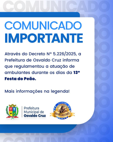 Com o objetivo de garantir a segurança e a fluidez do trânsito durante a realização da 13ª Festa do Peão de Osvaldo Cruz, a Prefeitura Municipal, seguindo recomendações da Polícia Militar e atendendo aos critérios de segurança viária, emitiu o Decreto nº 5.226/2025 sobre ambulantes na região do Centro Comercial Lino Ferrari entre os dias 4 e 7 de junho deste ano.