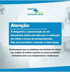 - Outra determinação é que é obrigatória a apresentação de documento com foto para visitar alguém internado na Santa Casa e troca de acompanhantes. Não será permitida visita ou troca de acompanhante sem documento.