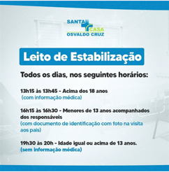 - Pacientes internados em LEITOS DE ESTABILIZAÇÃO: pessoas acima de 18 anos e com informação médica, todos os dias, das 13h13 às 13h45; menores de 13 anos acompanhados dos pais ou responsáveis – das 16h15 às 16h30 (devem portar documento com foto); das 19h30 às 20h visitantes com idade igual ou acima de 13 anos sem informação médica.