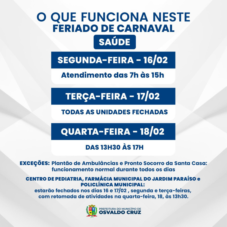 O Centro de Pediatria e a Farmácia Municipal do Jardim Paraíso estarão fechados na segunda e na terça-feira. Os atendimentos serão retomados na quarta-feira de Cinzas, a partir das 13h30.