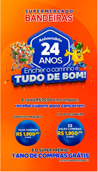O Supermercado Bandeiras lançou a nova campanha para comemorar o aniversário de 24 anos da empresa. ‘Aniversário 24 anos - Encher o Carrinho é Tudo de Bom’, começou no último domingo, dia 01 de setembro, e vai até o aniversário do supermercado em janeiro de 2025.