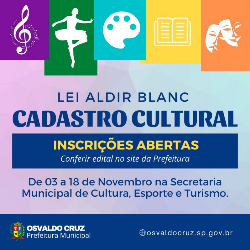 Termina nesta quinta-feira (18), o prazo para a realização das inscrições de artistas em nova etapa da Lei Aldir Blanc, que devem ser feitas na Secretaria de Esportes, Cultura e Turismo do município de Osvaldo Cruz.