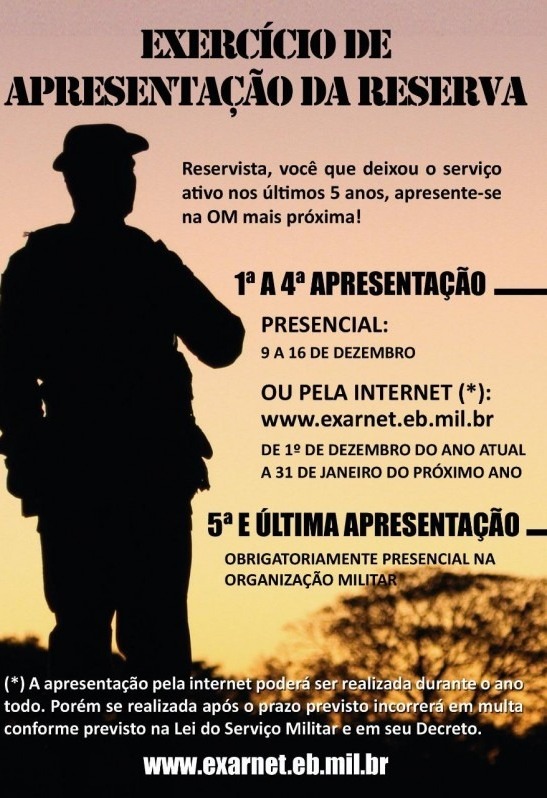 Para quem prestou o Serviço Militar e foi licenciado no período de 1º de dezembro de 2017 até o dia 30 de novembro de 2021, e estando em dia com as suas apresentações, fazer sua apresentação pela internet no portal do EXAR (exarnet.eb.mil.br), de 01 de dezembro de 2022 a 31 de janeiro de 2023.