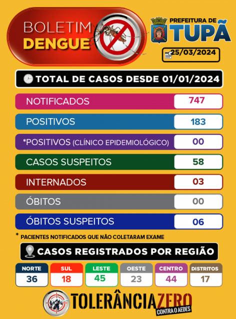 TUPÃ - O Departamento de Entomologia e Endemias da Secretaria Municipal de Saúde emitiu novo boletim informativo da dengue, segundo os dados da prefeitura na semana que abrange de 18 a 14 de março, foram confirmados 17 casos de dengue. Do início do ano até esta segunda-feira (25), foram notificados 747 casos suspeitos, sendo 183 positivos.