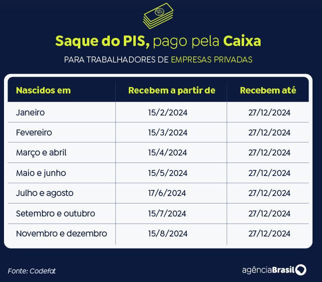 O PIS é pago pela Caixa Econômica Federal e o Pasep, pelo Banco do Brasil. Como ocorre tradicionalmente, os pagamentos serão divididos em seis lotes, baseados no mês de nascimento, no caso do PIS, e no número final de inscrição, no caso do Pasep. O saque iniciará nas datas de liberação dos lotes e acabarão em 27 de dezembro de 2024. Após esse prazo, será necessário aguardar a convocação especial do Ministério do Trabalho e Previdência.