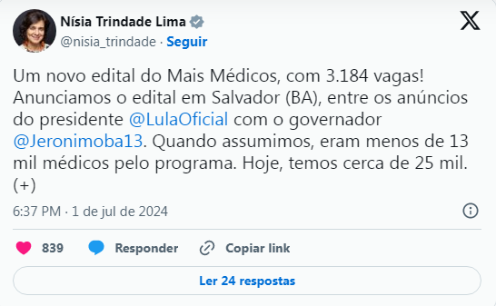 Nas postagens, Nísia Trindade afirmou que o novo edital vai permitir a reposição de vagas com vista a chegar à meta de 28 mil médicos.