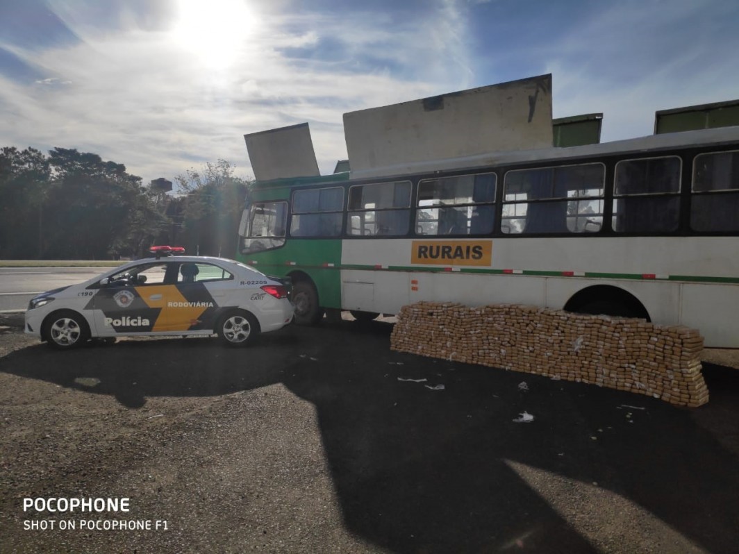 Utilizado para o transporte de trabalhadores rurais, um ônibus foi apreendido pela Polícia Militar Rodoviária (PMR) com 860 tijolos de maconha escondidos em um fundo falso no teto do veículo.