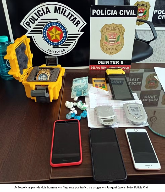 Dois homens, de 26 e 27 anos, foram presos em flagrante, nesta terça-feira (6), por tráfico de drogas, no Jardim dos Pássaros, em Junqueirópolis.