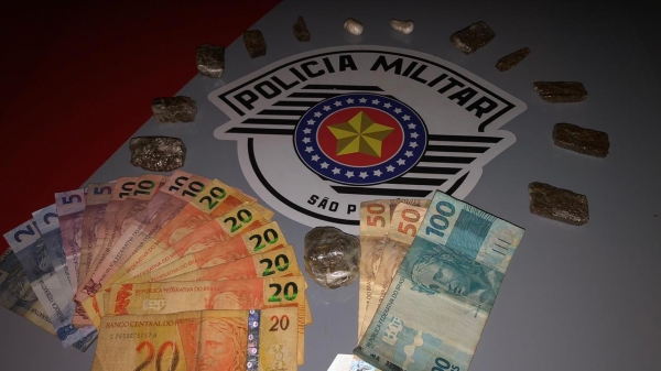 Diante aos fatos e com o apoio de outras equipes da PM, que estavam de prontidão, o suspeito foi abordado, sendo necessário o uso de algemas para contê-lo. Durante busca pessoal foi localizada em suas vestes uma porção de maconha. Já em buscas no quintal, junto ao local onde foi avistado na observação, foram localizadas 11 porções de maconha e duas porções de cocaína. Em busca domiciliar, os policiais encontraram R$ 386 em dinheiro em uma blusa no guarda-roupas.