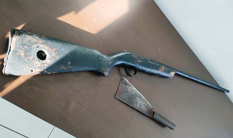 A Polícia Militar informou que, no intuito de impedir tal ato, as equipes agiram rapidamente na contenção do indiciado, utilizando inicialmente um disparo da Taser que, porém, se fez ineficiente pois um dos dardos foi obstruído por um móvel, e na sequencia fazendo a imobilização do acusado que havia arrombado a porta dos fundos, de acesso a residência, com intuito de alcançar sua arma. Os PMs destacam ainda que o indivíduo foi contido e durante sua imobilização o mesmo desferiu golpes de socos e chutes contra as equipes, mais foi imobilizado e algemado e, durante busca na residência, foi localizada uma espingarda, que foi apreendida juntamente com a faca.