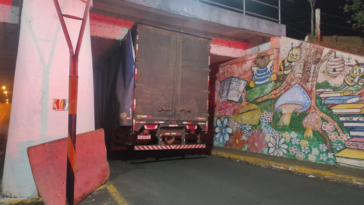 O local tem altura máxima de 3,5 metros, indicada com inscrição no local, mas o motorista mesmo com alerta de um funcionário da prefeitura, tentou passar com o caminhão, ficando enroscado no teto da estrutura do viaduto.