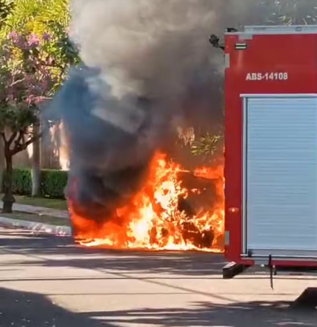 Um carro pegou fogo, na manhã desta segunda-feira (21), na rua do condomínio residêncial Jardim João Paulo 2º, em Presidente Prudente (SP).