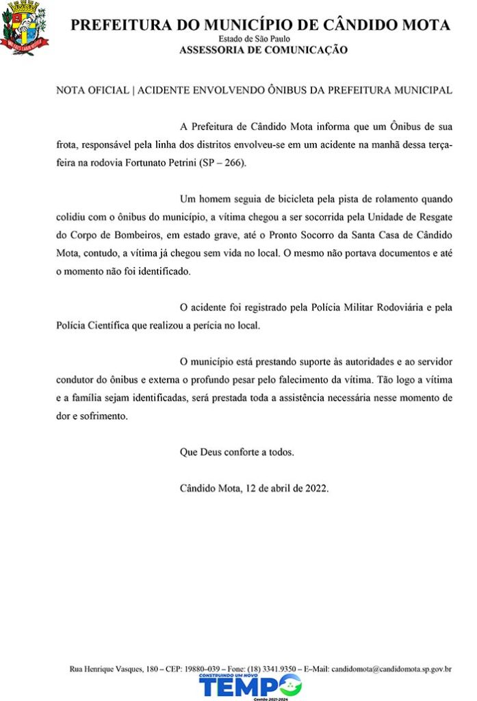 Na manhã da segunda-feira, 11 de abril, um ciclista morreu após se envolver em um acidente com um ônibus da Prefeitura de Cândido Mota na Rodovia Fortunato Petrini (SP-266) em Cândido Mota.A prefeitura emitiu uma nota oficial sobre o acidente na manhã desta terça-feira, 12 de abril, falando sobre o ocorrido.Segundo a nota o ciclista seguia pela pista de rolamento quando bateu de frente com o ônibus do município, responsável pela linha dos distritos.
