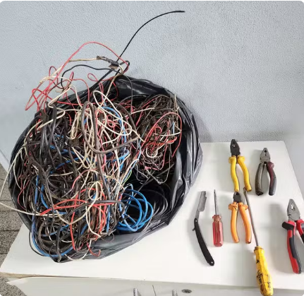 Durante a busca pessoal, a PM localizou dentro da mochila do rapaz quatro alicates, duas chaves de fenda, um barbeador, um facão e uma faca. Já no interior do saco, foi localizada a fiação elétrica.