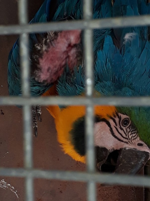 Após solicitação do Corpo de Bombeiros, uma equipe da Polícia Ambiental resgatou uma arara-canindé (ara ararauna) em uma residência no Jardim Santa Clara.