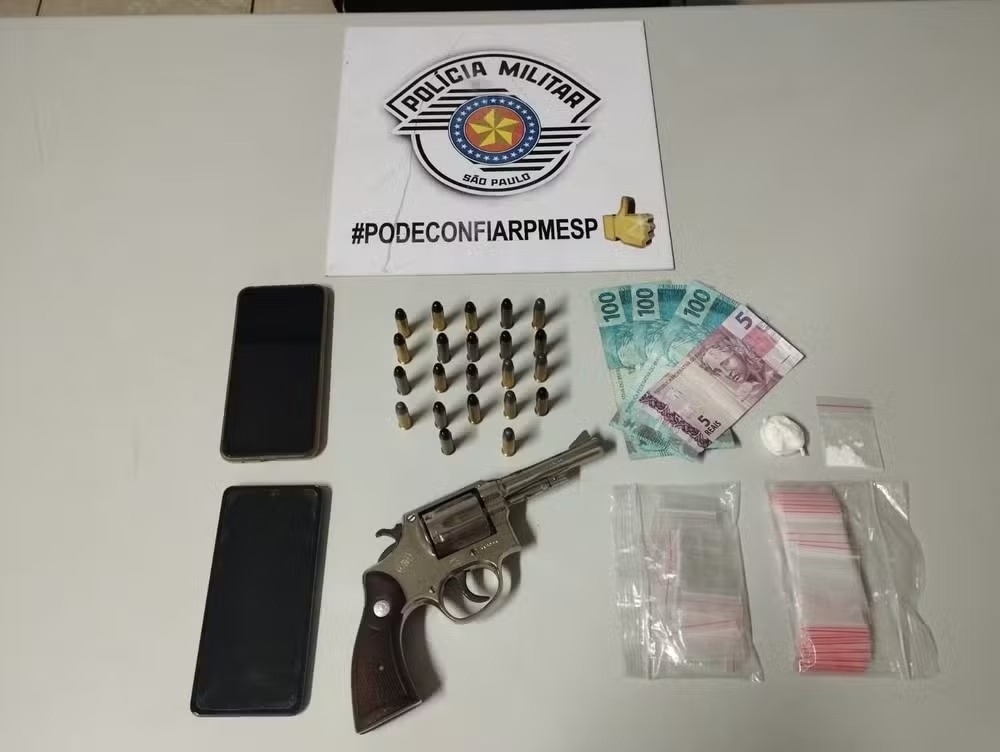Nas abordagens aos envolvidos, os policiais apreenderam, no total, um revólver e 22 munições de calibre 38, dois celulares, R$ 305,00 em dinheiro, duas porções de cocaína (5,63 gramas) e dois pacotes com saquinhos plásticos vazios suspeitos de utilização como embalagens de droga.