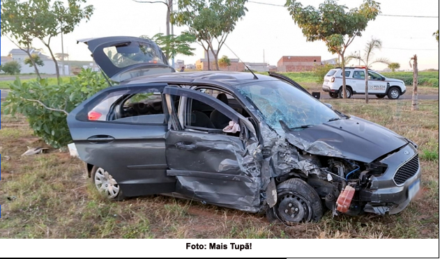 TUPÃ - No início da manhã deste domingo (9), o condutor de um veículo Ford Ka trafegava pela Rua Apiacá, no Reserva Tupã, quando no final da rua perdeu controle da direção ao tentar realizar uma curva a esquerda subindo na calçada atingindo um poste de iluminação pública e algumas árvores ao invadir uma área verde.