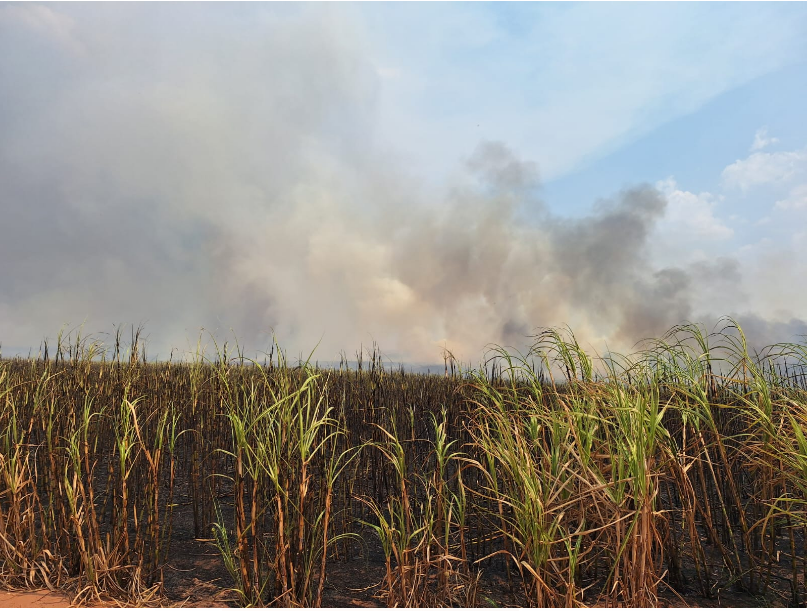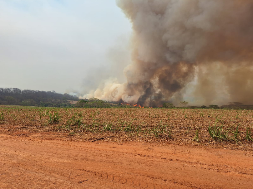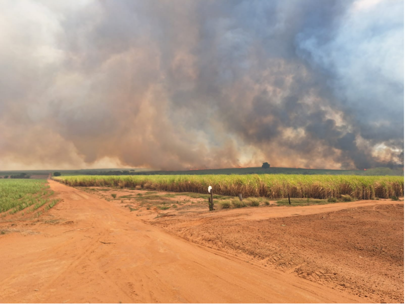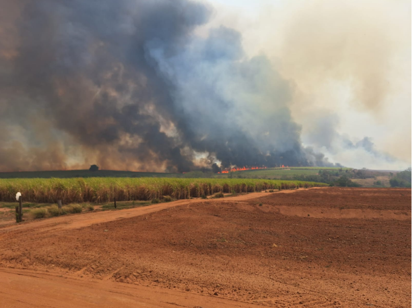 A região, que além de matas tem plantios de cana-de-açúcar, vem apresentando focos de incêndio há vários dias.