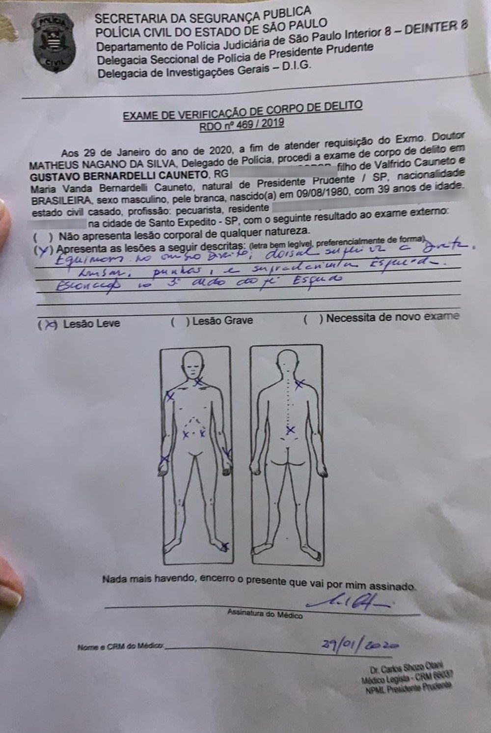 Sobre as acusações da defesa de Gustavo Bernardelli Cauneto, de que ele teria apanhado da polícia, a Delegacia Seccional de Polícia de Presidente Prudente (SP) reiterou que a prisão dele foi cumprida com observância às normas legais, sendo certo que no momento da detenção houve resistência.