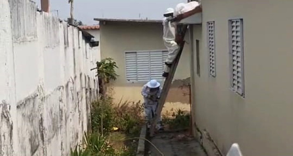 Os bombeiros informaram que realizaram a contenção emergencial das abelhas utilizando um saco de estopa para fechar o buraco da colmeia e fizeram fumaça no local para que os insetos se acalmassem.