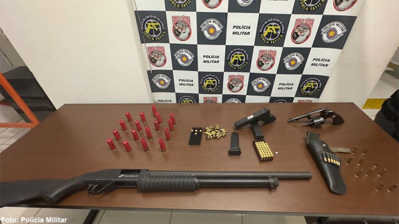 A Polícia Militar complementa que, no decorrer da apuração, constatou-se que o indivíduo ferido a tiros tinha contra sua pessoa uma medida protetiva de urgência em favor de sua ex-companheira e que, anteriormente, havia ido até a residência da ex-esposa e como não a encontrou se deslocou a residência do genro, com a finalidade de localizá-la, onde teria chegado em tom ameaçador. Os PMs acrescentam que o genro disse que, como tinha conhecimento de que o sogro possuía armas de fogo, temeu por sua integridade física e efetuou os disparos.Também de acordo com o registro da Polícia Militar foi apurado que, depois dos disparos cessarem, o indivíduo ferido teria arremessado seu veículo contra o portão da residência, danificando-o e colidindo contra o batente da porta, foi providenciado socorro médico ao ferido e, na sequência, a ex-esposa do indivíduo ferido chegou ao local visivelmente abalada e temerosa por sua vida e confirmou a existência de armas de fogo pertencentes ao ex-marido.A Polícia Militar destaca que em revista veicular no automóvel do indivíduo ferido foi localizada uma arma branca em seu interior, que foi apreendida juntamente com mais duas munições (uma deflagrada e outra intacta). Os policiais militares ressaltam que foram apreendidos mais dois armamentos e munições, juntamente com outros materiais, totalizando três armas de fogo: 1 espingarda calibre 12 CBC com 10 munições intacta e 7 munições deflagras, 1 pistola 9 mm, 39 munições intactas e 34 munições deflagradas e dois carregadores, 1 revólver 38 sem numeração com 12 munições intactas e 2 munições deflagradas, e uma arma branca.Conforme a PM, as partes foram encaminhadas ao Plantão Policial, juntamente com os objetos apreendidos, e após apreciação dos fatos a delegada ratificou a voz de prisão ao indivíduo pelo crime porte ilegal de arma de fogo com numeração suprimida e pelo crime tentativa de homicídio (legítima defesa) e para o outro envolvido ferido deu voz de prisão pelo crime Maria da Penha, ameaça e descumprimento de medida protetiva, e ambos permaneceram a disposição da Justiça.Atenderam a ocorrência a Força Tática com 1° sargento Fantes, cabo Alex e cabo Alan, 1° sargento Valentin, soldado J. Santos e soldado Vinicius, cabo Conelian e cabo Júlio César e cabo Combinato e cabo Clóvis.