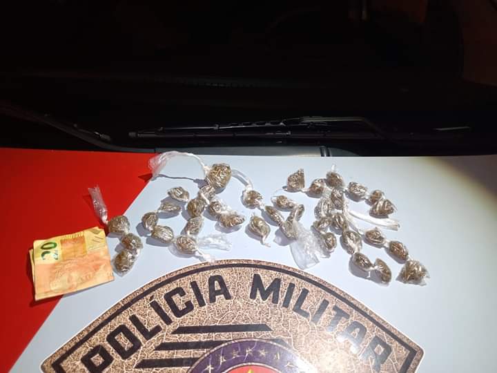 Foi encontrado com ele três porções de maconha e o valor de R$ 20,00 proveniente do tráfico. No quintal da residência do mesmo, foram localizadas mais 34 porções de maconha.