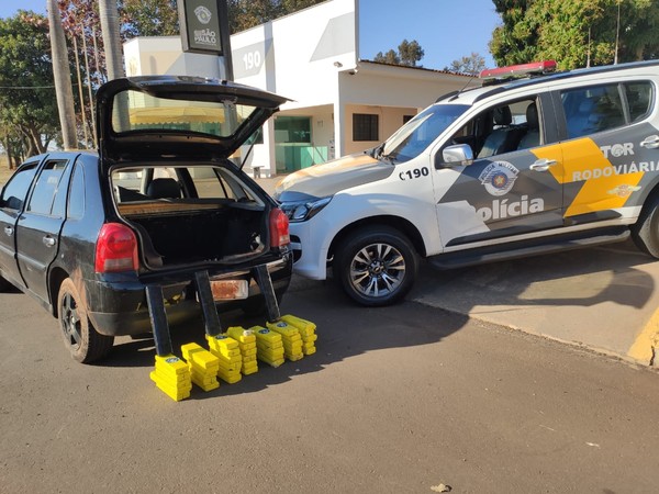 Durante a Operação Paz e Proteção, o Tático Ostensivo Rodoviário (TOR) abordou um carro e, na fiscalização, localizou dentro dos forros das portas, interior do painel e encosto do banco traseiro 40 tabletes de maconha.
