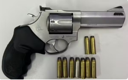 Durante a vistoria no quarto do suspeito, dentro do guarda-roupa, foi localizado um revólver calibre 357, acompanhado de sete munições 357 e duas 38.