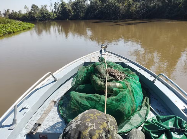 Já pela lagoa marginal, no Rio Paraná, foram localizados quatro peneiras e cinco covos armados.