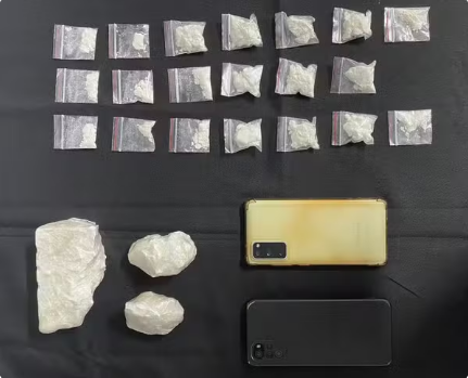 Dentro do carro foram encontrados sobre o banco dianteiro do passageiro 20 saquinhos de plástico com uma substância esbranquiçada semelhante a cocaína, prontos para serem vendidos. Na mesma sacola havia três porções maiores da droga e, no interior do veículo, dois aparelhos celulares.