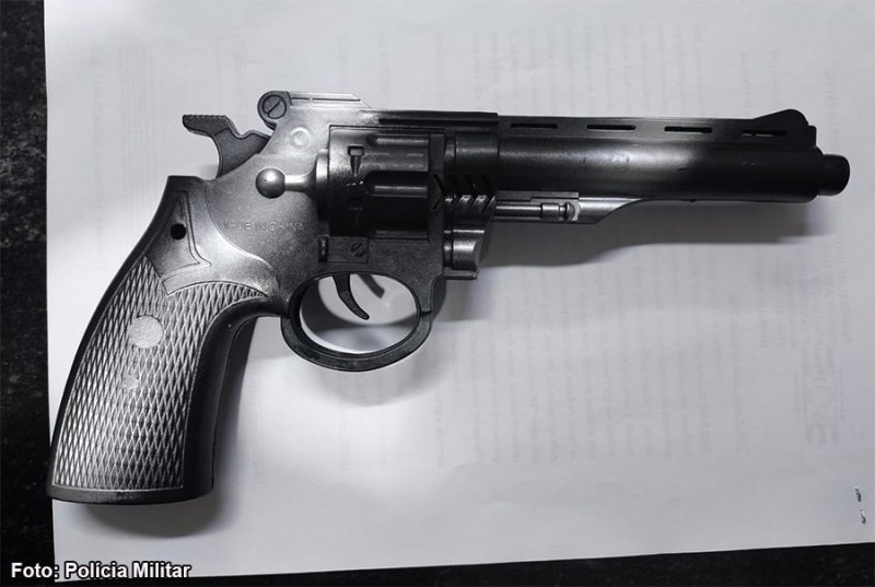 Após o acionamento via 190, os Policiais rapidamente se deslocaram até o local e, com base nas imagens e características do autor, iniciaram diligências pela região. Em cerca de 25 minutos, o ladrão foi localizado e abordado ainda com o simulacro utilizado no crime.