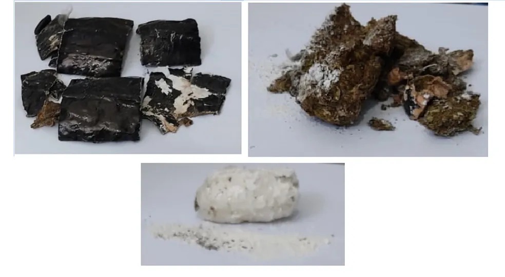 Na embalagem havia três porções de substâncias que aparentavam ser cocaína e as drogas sintéticas N-4 e Flor.