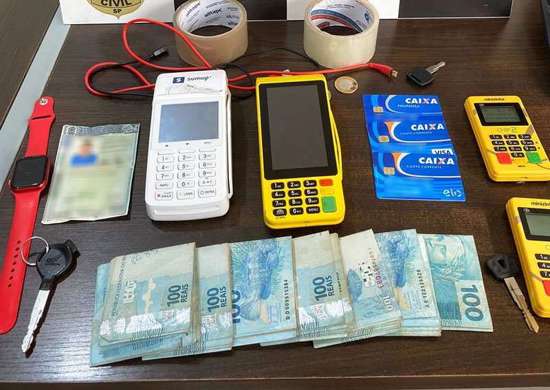 No hotel em que foi preso S.J.S., foram apreendidas quatro máquinas de cartão, a quantia de R$ 6.360,00 em dinheiro, cartões bancários em nomes das vítimas, uma Carteira Nacional de Habilitação falsificada, um relógio Apple Watch, um automóvel marca Mitsubishi, modelo Lancer, três capacetes e dois comprovantes de saques nas contas das vítimas, ambos efetivados nesta manhã, em agência bancária na cidade de Bastos.
