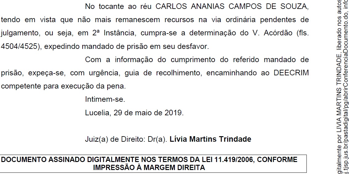 Em sua decisão liberado nos autos em 29 de maio último, às 17h20, conforme Processo 0002022-53.2005.8.26.0326, ela escreve: No tocante ao réu Carlos Ananias Campos de Souza, tendo em vista que não mais remanescem recursos na via ordinária pendentes de julgamento, ou seja, em 2ª Instância, cumpra-se a determinação do V. Acórdão (fls. 4504/4525), expedindo mandado de prisão em seu desfavor. Com a informação do cumprimento do referido mandado de prisão, expeça-se, com urgência, guia de recolhimento, encaminhando ao DEECRIM competente para execução da pena.