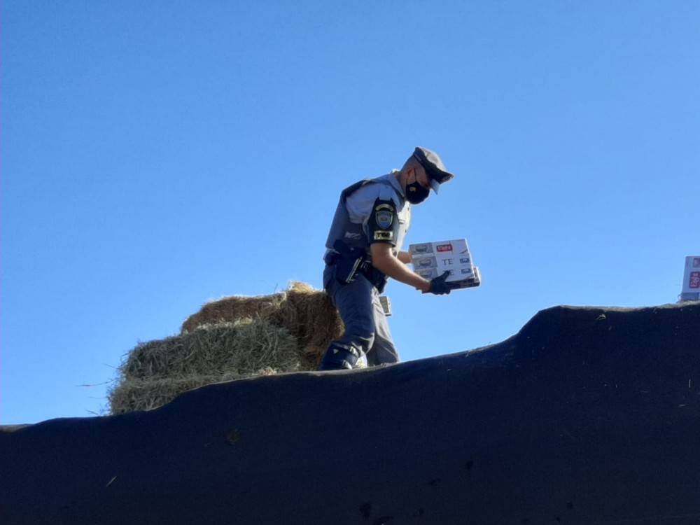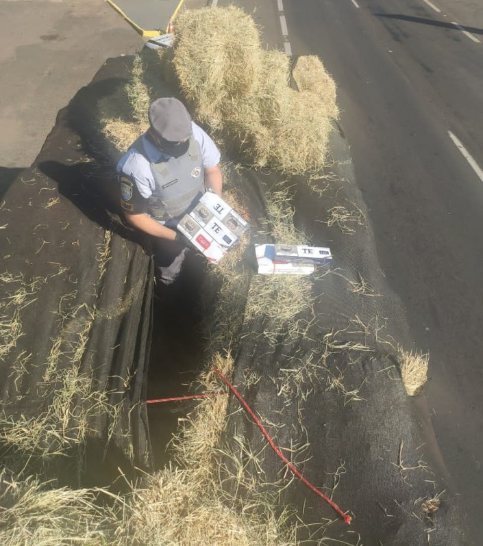 A vistoria no compartimento de carga do caminhão resultou na localização de 300 caixas com 15 mil pacotes de cigarros contrabandeados do Paraguai, sem documentação fiscal, que estavam escondidas embaixo de um carregamento de feno.