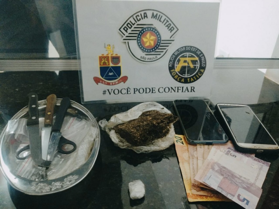 Foi apreendido um tablete de maconha (0,115 kg), uma porção de maconha (0,002 kg), R$ 65,00 e apetrechos para embalar drogas.
