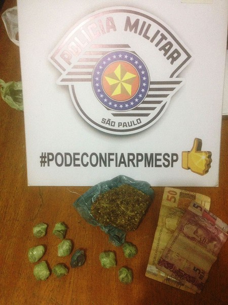 Em buscas na casa, foi localizado em um cômodo da residência, dentro de um colchão, envolvido em um saco plástico, 7 trouxinhas de maconha e mais um pedaço prensado da mesma droga.