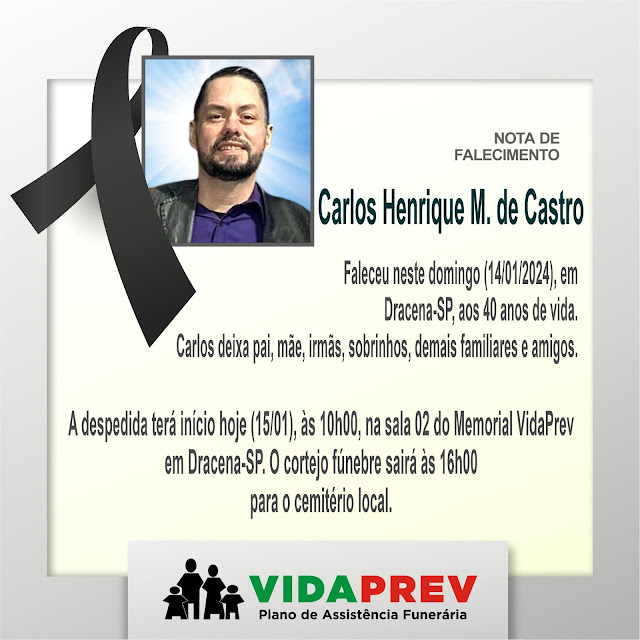 O conhecido Carlão era vendedor da empresa Drapema. O velório no Memorial VidaPrev começa às 10 horas, com sepultamento às 16 horas no Cemitério local.