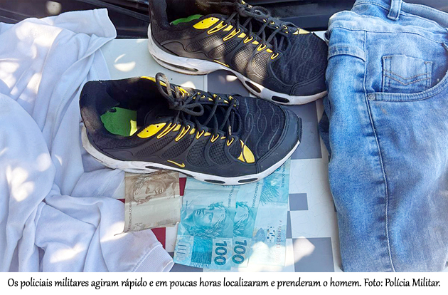 A Polícia Militar iniciou diligências imediatamente e conseguiu localizar o suspeito poucas horas depois. Parte do dinheiro roubado e outros pertences foram recuperados, além das roupas e calçados usados durante a ação criminosa.