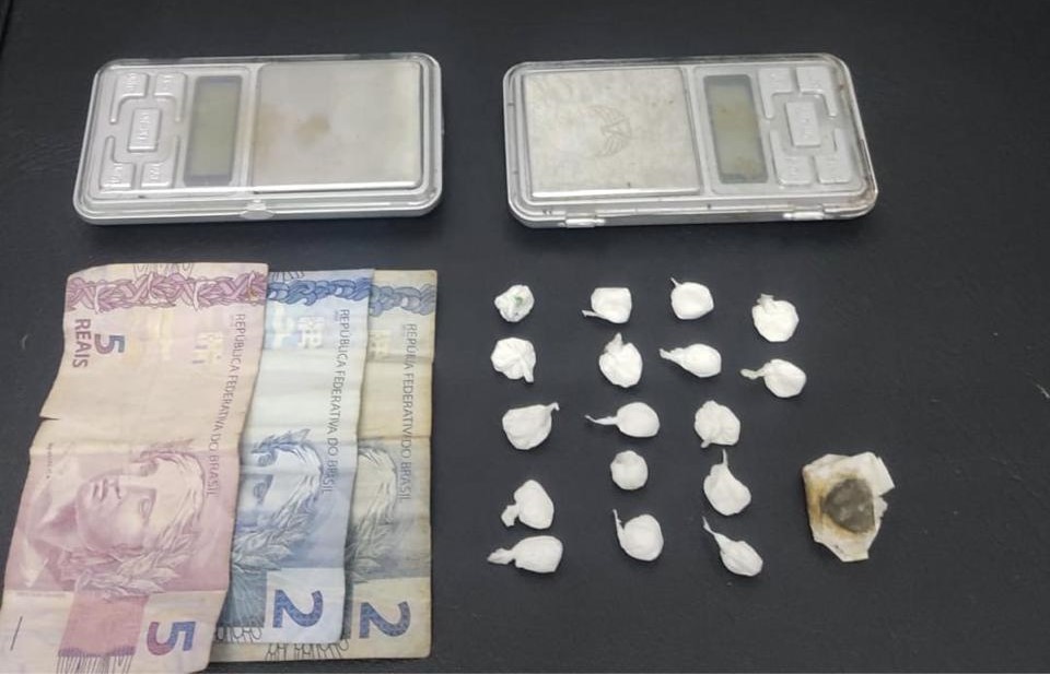 Em uma pochete, foram localizadas quatro porções de cocaína, uma porção de dry e R$ 9.